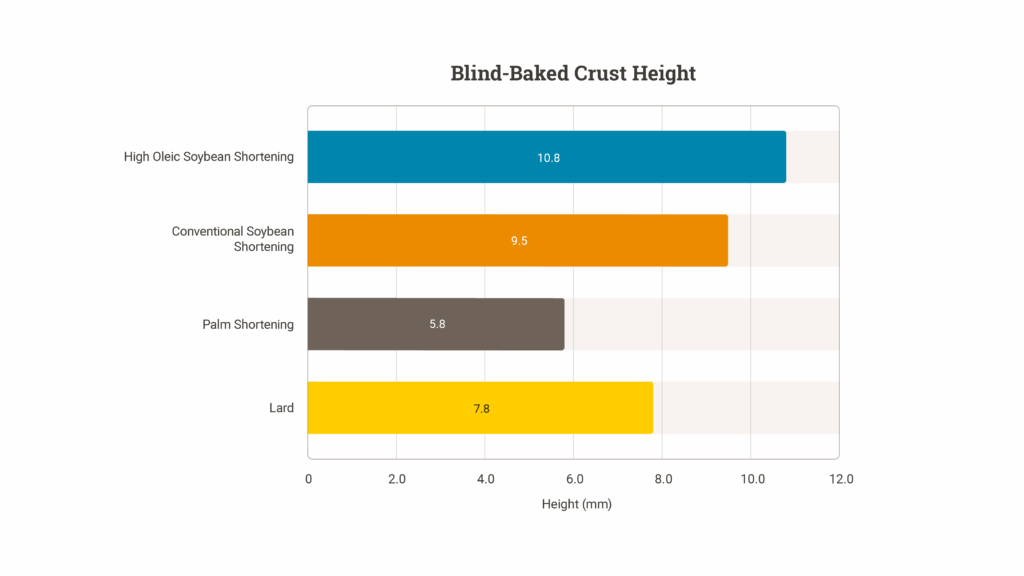High oleic soybean shortening produced pie crusts with desired characteristics, including evenly browned, textured, flaky crust with an ideal finished product height and minimal shrink.