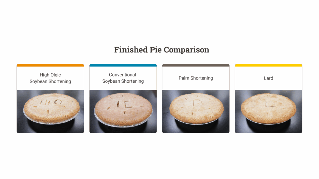 High oleic soybean shortening performed as well or better than partially hydrogenated oils, and outperformed palm-based shortenings and lard in all pie dough evaluations, including firmness, flakiness, height and temperature workability.