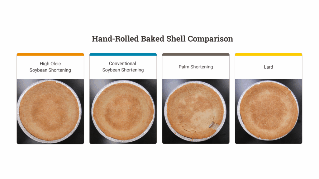 The dough made with high oleic soybean shortening also proved to be versatile, performing equally well under hand-rolling and a pie press. Pie crusts made with palm shortening resulted in the least height and showcased uneven browning and excess shrink while using the pie press.