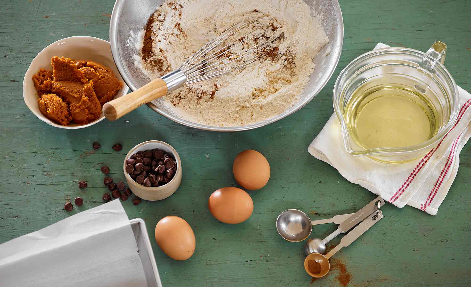 - 1. In a medium bowl, whisk flour, cinnamon, nutmeg, allspice, ginger, baking soda and salt. Add the chocolate chips and set aside.