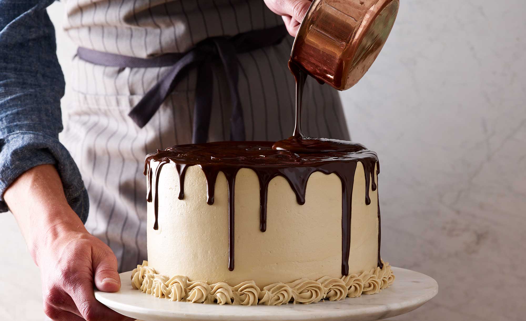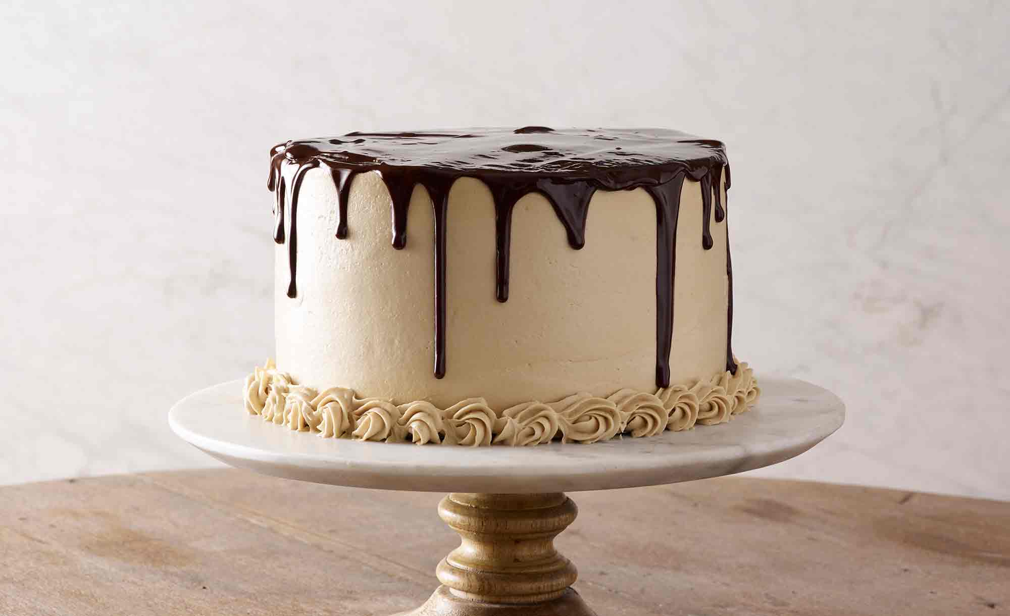 - 8. Pour the chocolate glaze onto the top center of your cake. Working quickly, spread the glaze outward (by turning the turntable) until the glaze starts to drip down the edge of the cake. Then, swirl the glazed top using the offset spatula, working from the outer rim of the cake to the center.